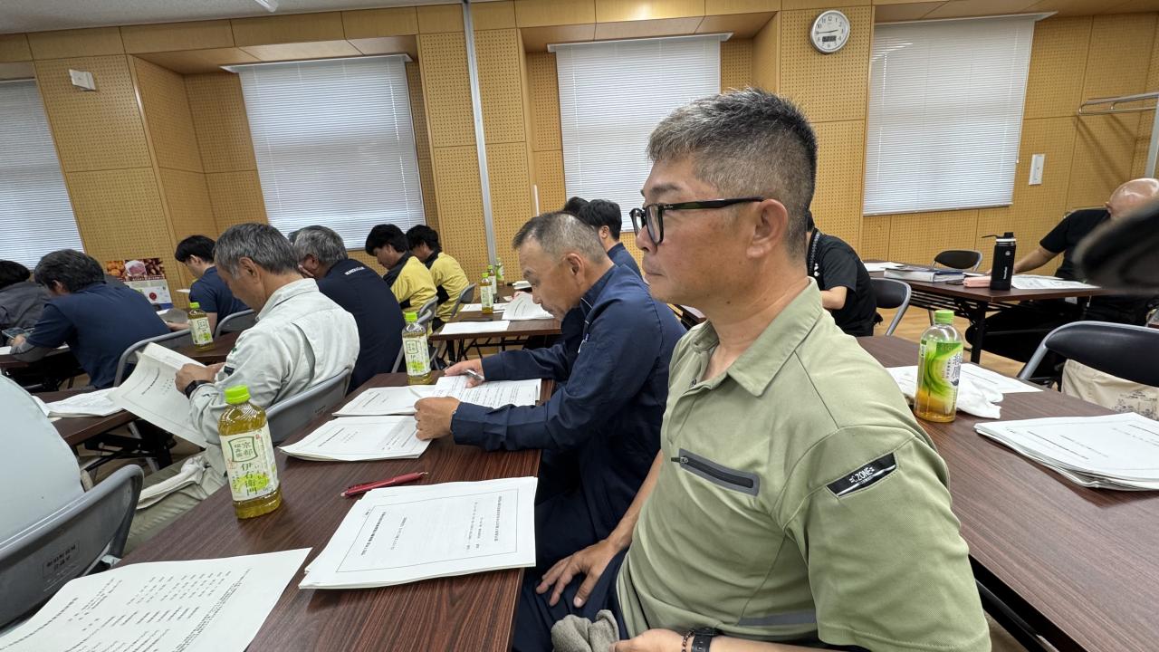 初日の業務は安全大会でございます。昨年度の業務結果の報告と反省を行った後、今年度の会社の目標、熱中症や事故防止対策について話し合いました。 今年度も無事故で終えるため、高い意識を持って作業に励む所存です。